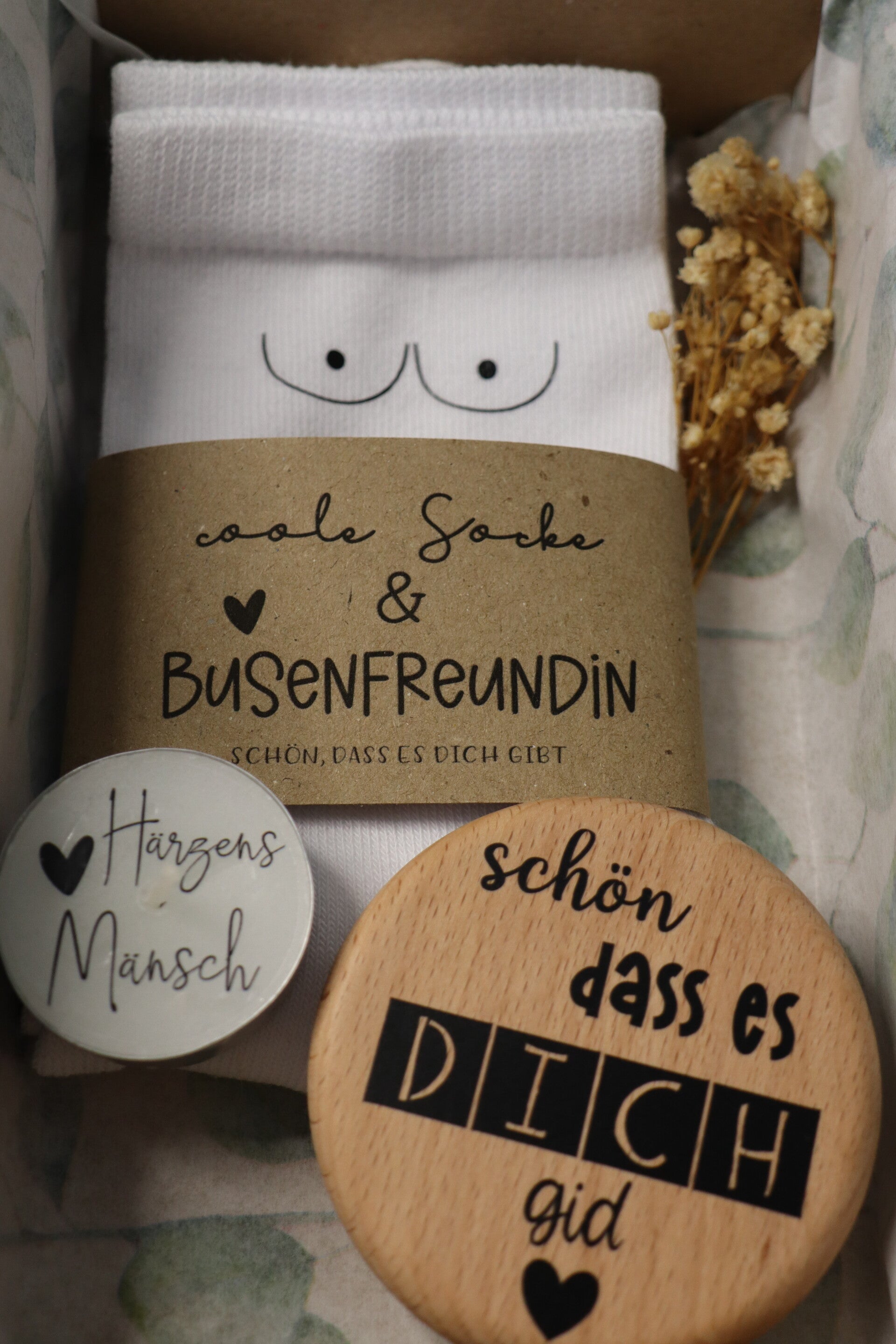 Die Box beinhaltet ein paar Socken, eine Kerze und ein Magnet oder einen Schlüsselanhänger.