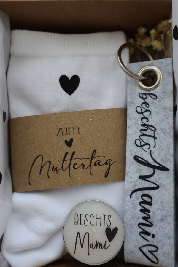 Die Box beinhaltet ein paar Socken und eine Kerze. Wahlweise findet ein runder oder ein länglicher Schlüsselanhänger Platz in der Box.